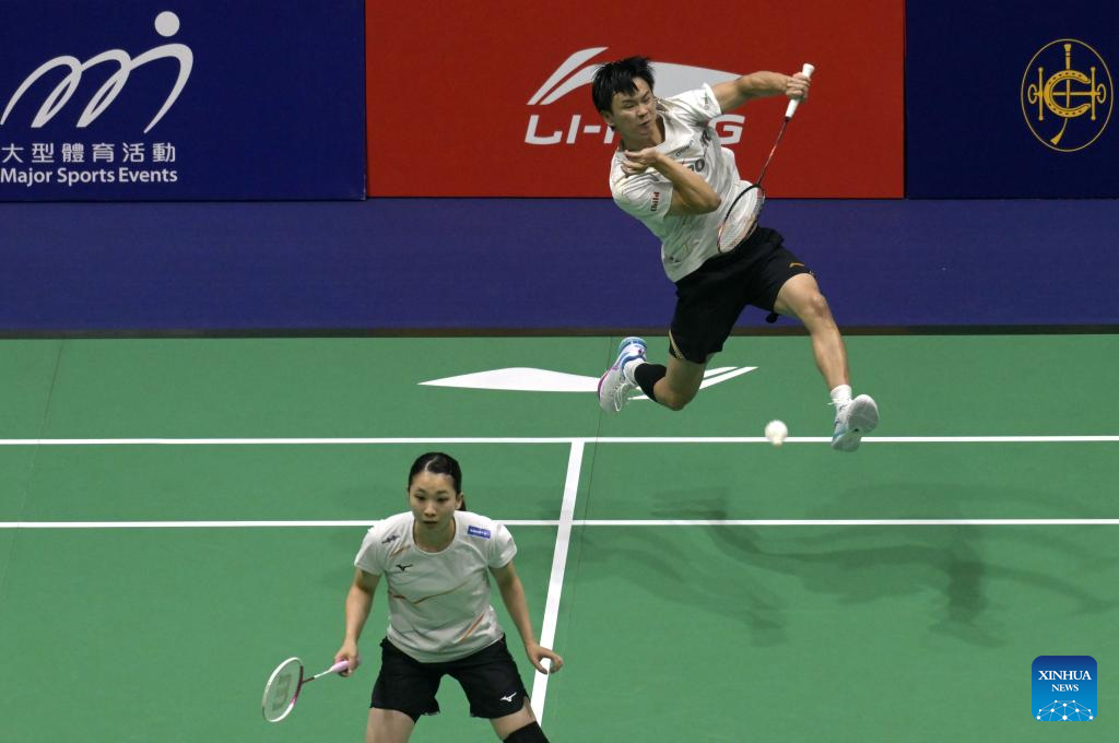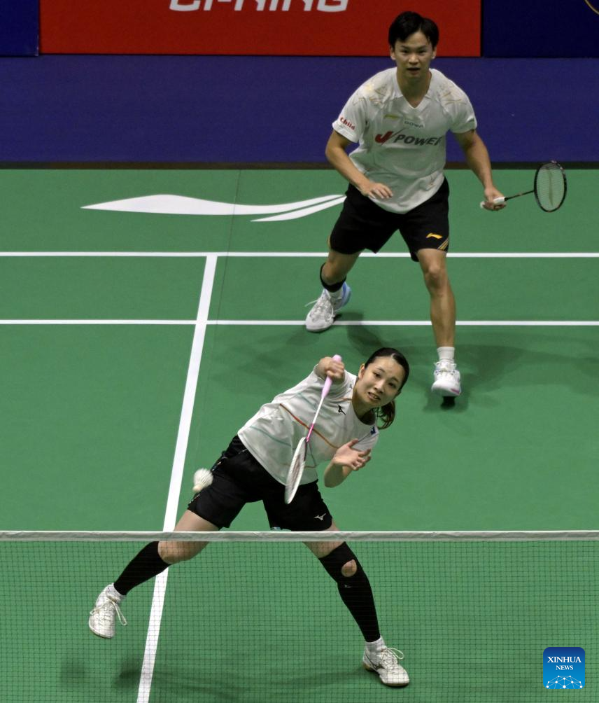 Watanabe Yuta(R)/Matsutomo Misaki of Japan compete against Loo Bing Kun/Go Pei Kee of Malaysia during the mixed doubles qualification match at Hong Kong Open badminton tournament 2025 in Hong Kong, south China, Sept. 9, 2025. (Xinhua/Lo Ping Fai)