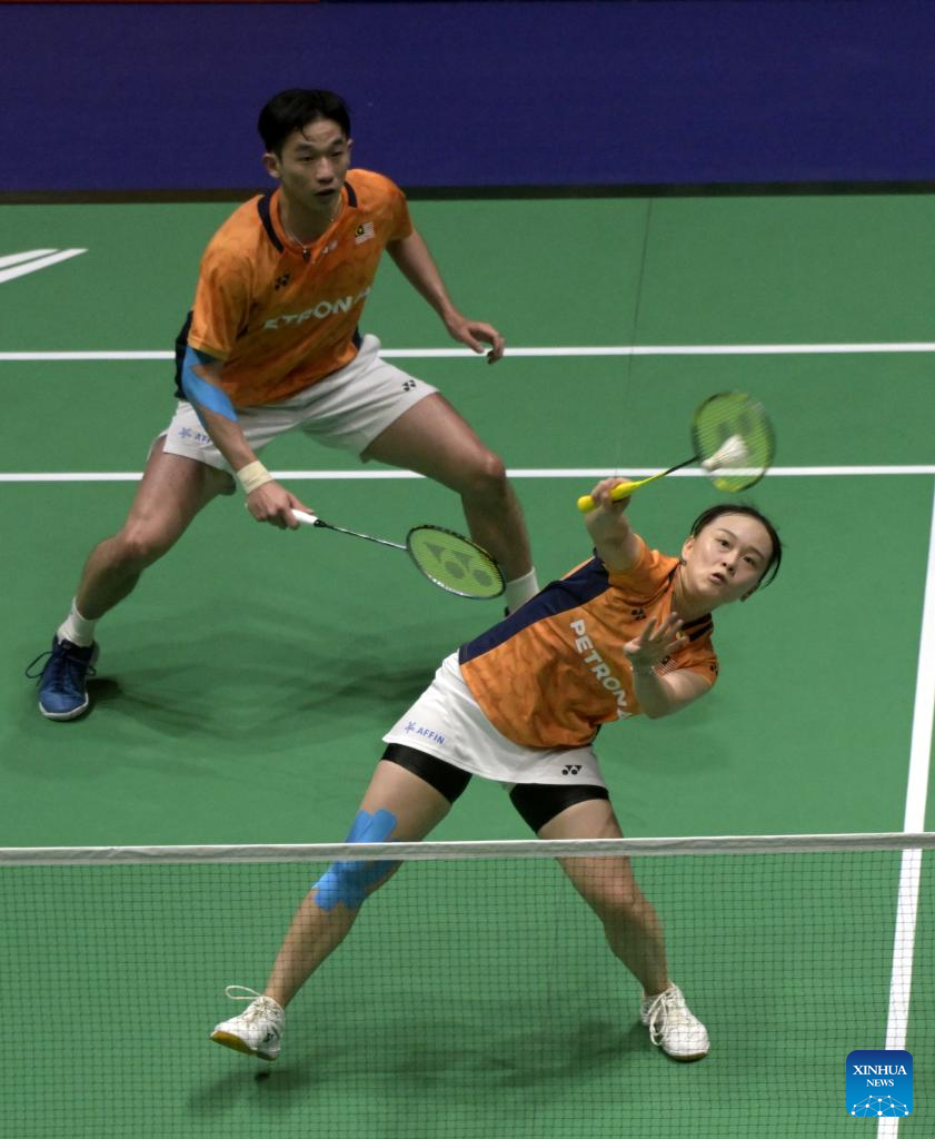Loo Bing Kun/Go Pei Kee(R) of Malaysia compete against Watanabe Yuta/Matsutomo Misaki of Japan during the mixed doubles qualification match at Hong Kong Open badminton tournament 2025 in Hong Kong, south China, Sept. 9, 2025. (Xinhua/Lo Ping Fai)
