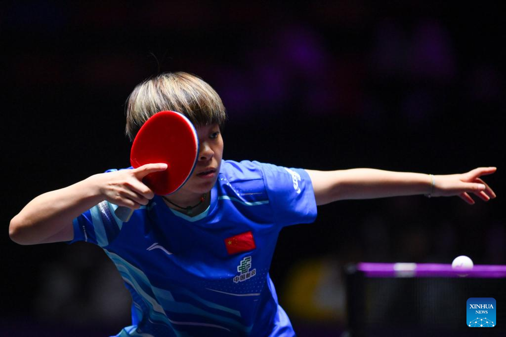 Wang Yidi of China hits a return during the women's singles round of 32 match against Kuan Cheok Lam of China's Macao at the 2025 World Table Tennis (WTT) Champions Macao in Macao, south China, Sept. 9, 2025. (Xinhua/Cheong Kam Ka)