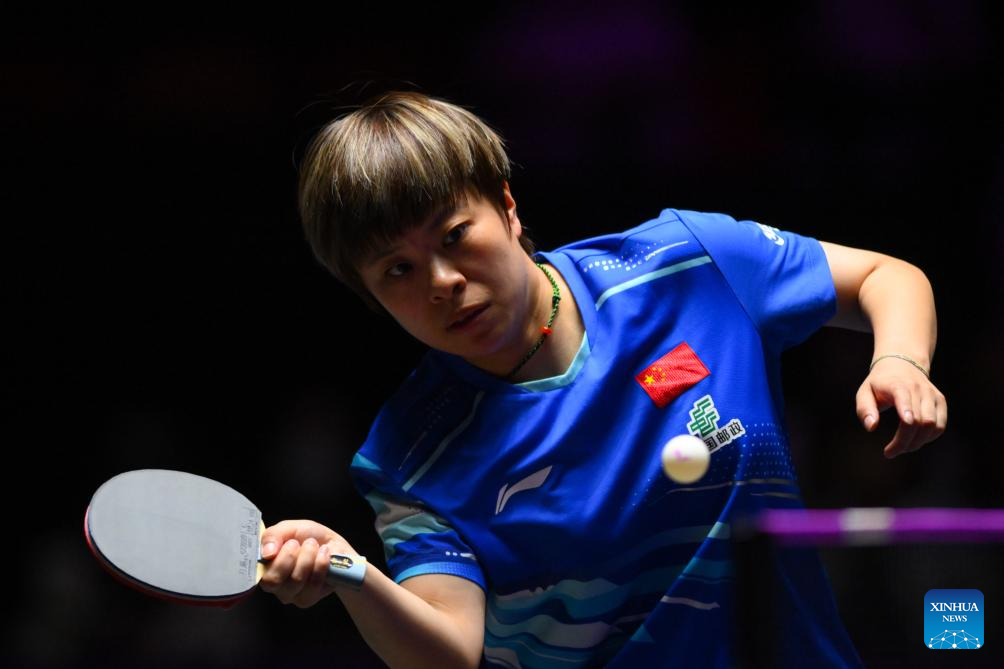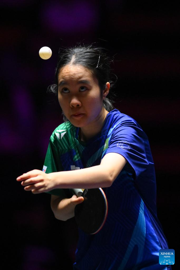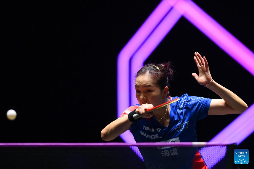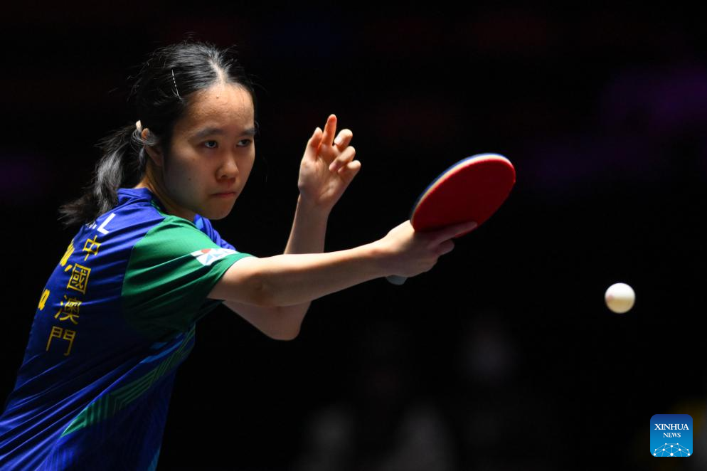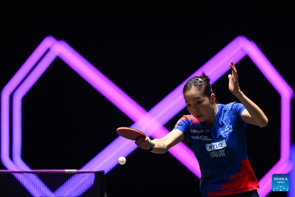 Kuan Cheok Lam of China's Macao hits a return during the women's singles round of 32 match against Wang Yidi of China at the 2025 World Table Tennis (WTT) Champions Macao in Macao, south China, Sept. 9, 2025. (Xinhua/Cheong Kam Ka)