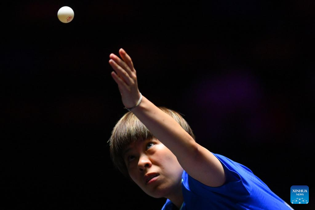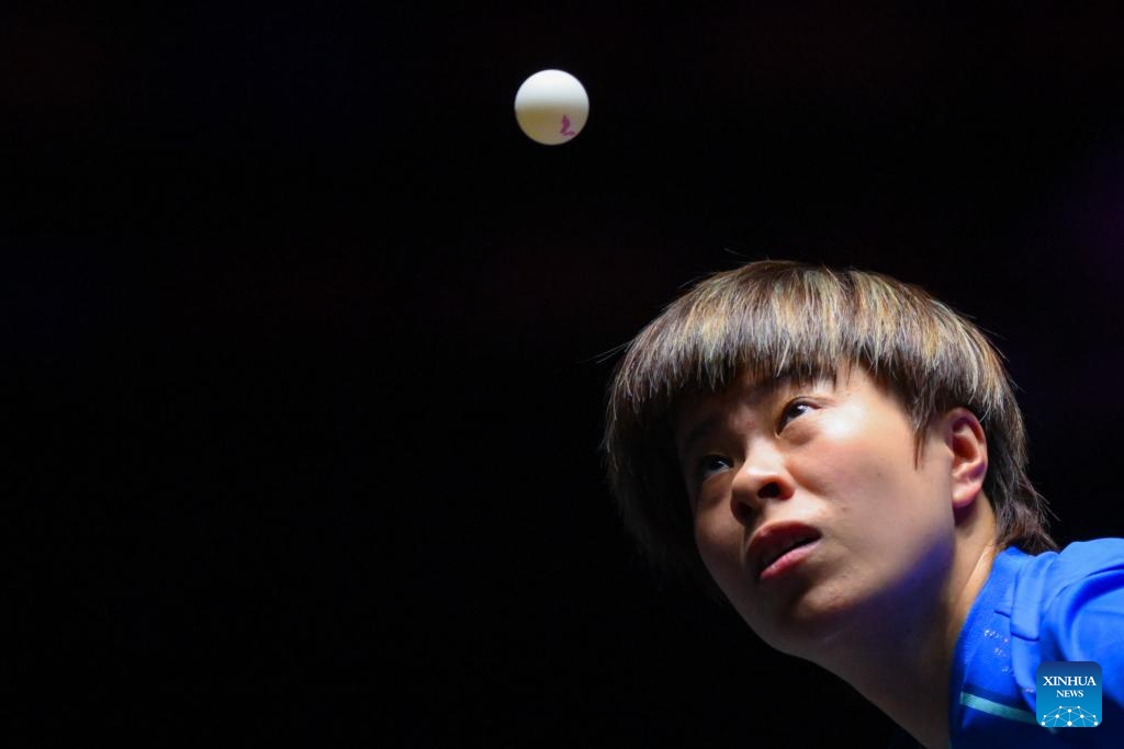 Wang Yidi of China serves during the women's singles round of 32 match against Kuan Cheok Lam of China's Macao at the 2025 World Table Tennis (WTT) Champions Macao in Macao, south China, Sept. 9, 2025. (Xinhua/Cheong Kam Ka)