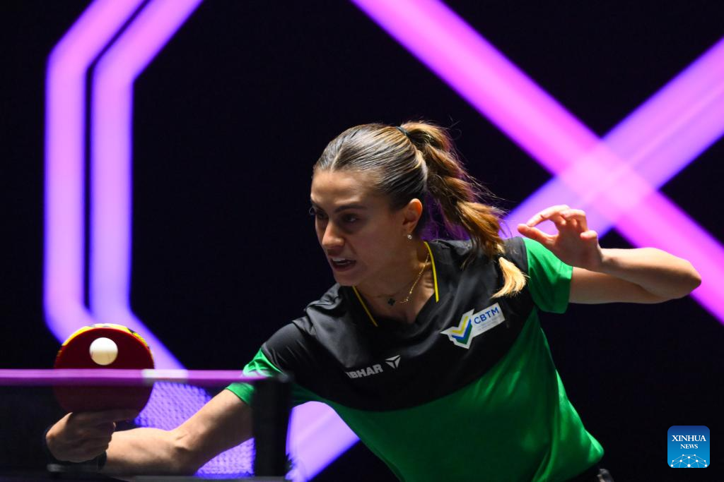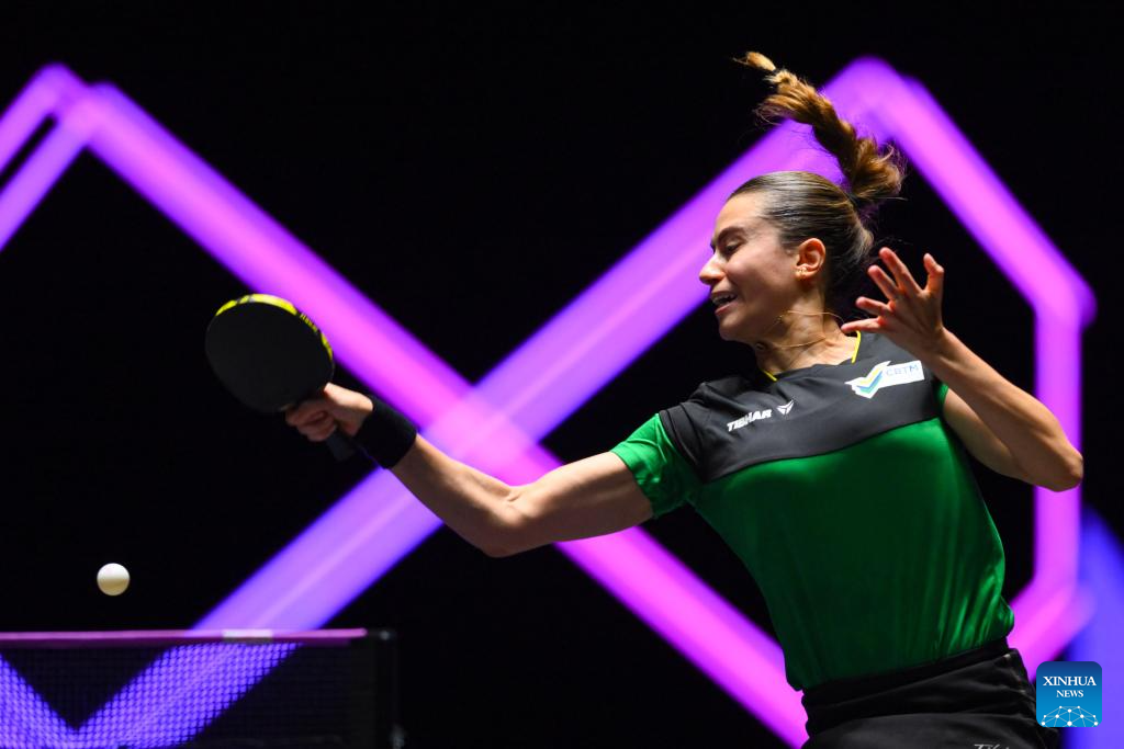 Bruna Takahashi of Brazil hits a return during the women's singles round of 32 match against Yuan Jianan of France at the 2025 World Table Tennis (WTT) Champions Macao in Macao, south China, Sept. 9, 2025. (Xinhua/Cheong Kam Ka)