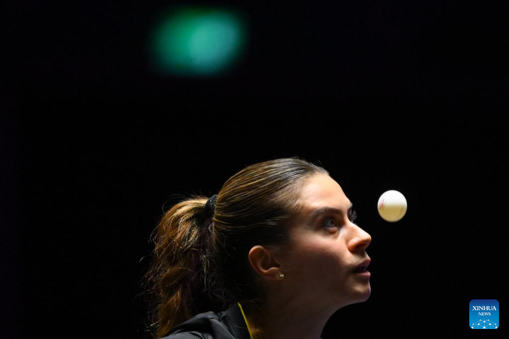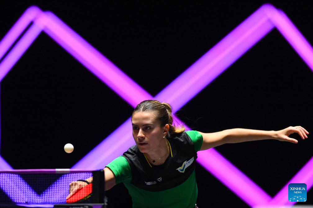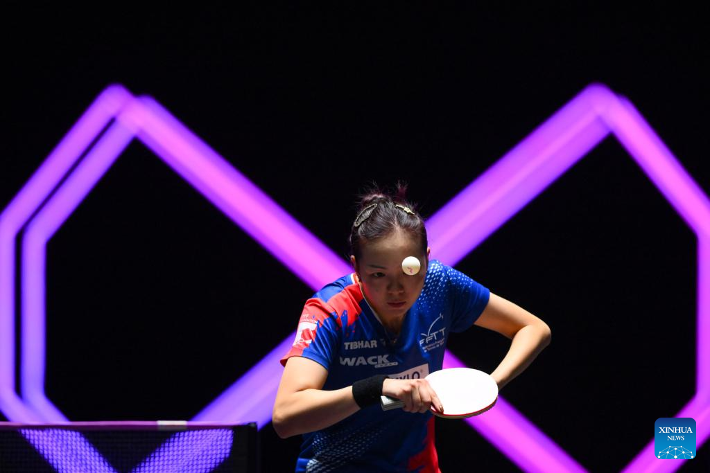 Yuan Jianan of France hits a return during the women's singles round of 32 match against Bruna Takahashi of Brazil at the 2025 World Table Tennis (WTT) Champions Macao in Macao, south China, Sept. 9, 2025. (Xinhua/Cheong Kam Ka)