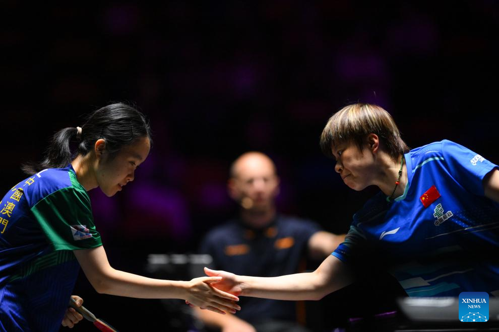 Kuan Cheok Lam (L) of China's Macao shakes hands with Wang Yidi of China after their women's singles round of 32 match at the 2025 World Table Tennis (WTT) Champions Macao in Macao, south China, Sept. 9, 2025. (Xinhua/Cheong Kam Ka)