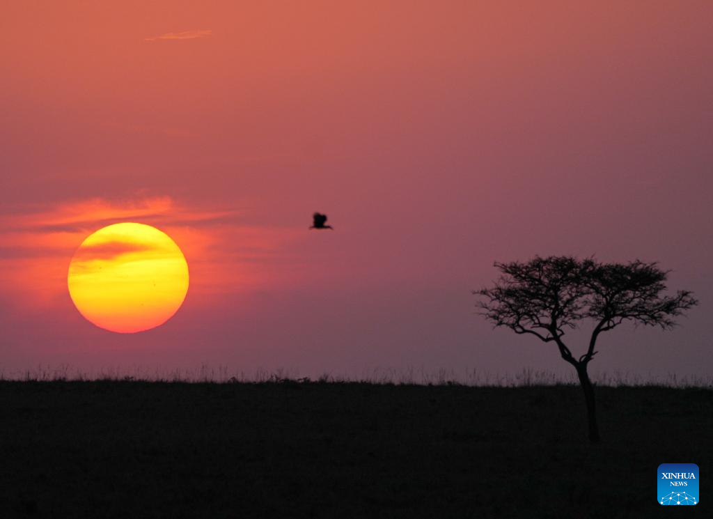 This photo taken on Sept. 6, 2025 shows a sunset view in the Masai Mara National Reserve in Kenya. Kenya's southwestern county of Narok is home to the world's famous Masai Mara National Reserve where tourists flock to during the country's peak tourism season from July through October to watch the wildebeest migration.