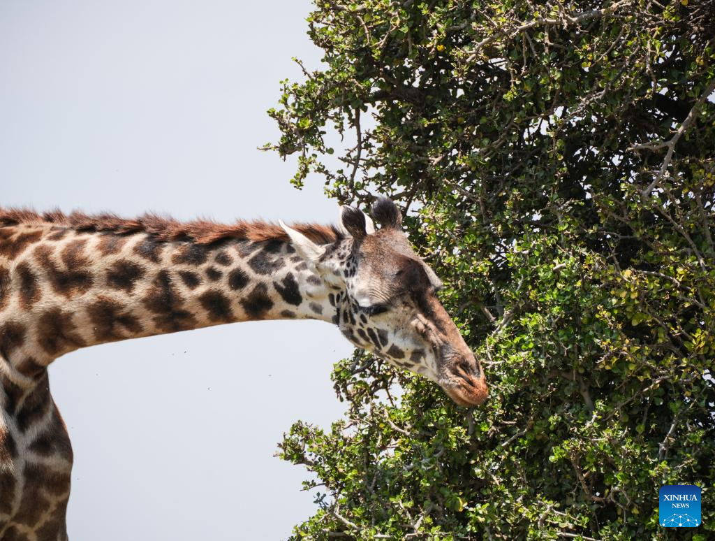A giraffe is pictured in the Masai Mara National Reserve in Kenya, on Sept. 6, 2025. Kenya's southwestern county of Narok is home to the world's famous Masai Mara National Reserve where tourists flock to during the country's peak tourism season from July through October to watch the wildebeest migration.