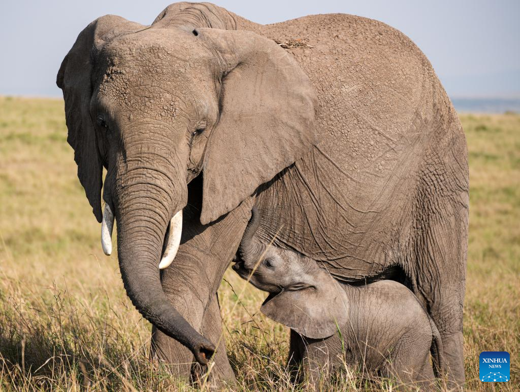 A baby elephant and its mother are pictured in the Masai Mara National Reserve in Kenya, on Sept. 7, 2025. Kenya's southwestern county of Narok is home to the world's famous Masai Mara National Reserve where tourists flock to during the country's peak tourism season from July through October to watch the wildebeest migration.