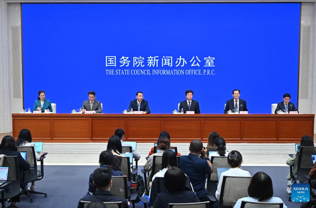 Guan Zhiou, minister of natural resources and general supervisor of national natural resources, and Liu Guohong, director of the National Forestry and Grassland Administration (National Park Administration), attend a press conference held by the State Council Information Office (SCIO) on achievements in high-quality natural resources development during the 14th Five-Year Plan period (2021-2025) in Beijing, capital of China, Sept. 10, 2025. (Xinhua/Cai Yang)