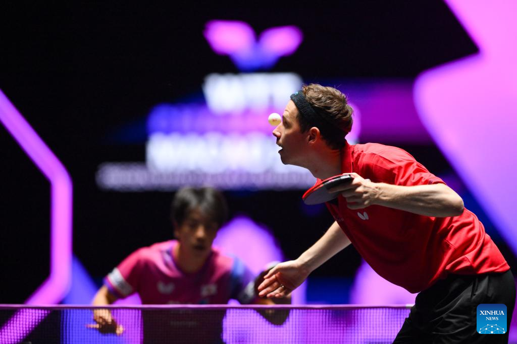 Jonathan Groth of Denmark hits a return during the men's singles round of 32 match against Shinozuka Hiroto of Japan at the 2025 World Table Tennis (WTT) Champions Macao in Macao, south China, Sept. 10, 2025. (Xinhua/Cheong Kam Ka)