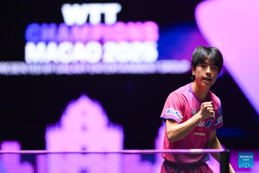 Shinozuka Hiroto of Japan celebrates scoring during the men's singles round of 32 match against Jonathan Groth of Denmark at the 2025 World Table Tennis (WTT) Champions Macao in Macao, south China, Sept. 10, 2025. (Xinhua/Cheong Kam Ka)