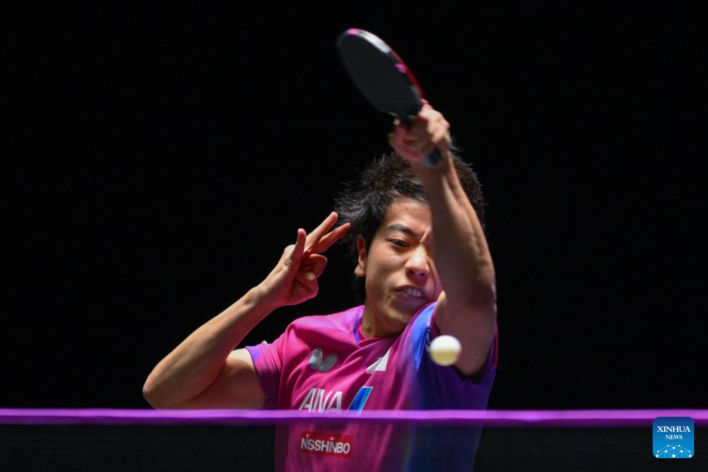 Shinozuka Hiroto of Japan hits a return during the men's singles round of 32 match against Jonathan Groth of Denmark at the 2025 World Table Tennis (WTT) Champions Macao in Macao, south China, Sept. 10, 2025. (Xinhua/Cheong Kam Ka)