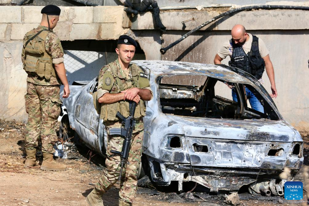 Lebanese soldiers inspect the wreckage of a car hit by Israeli drones in Jiyeh, Lebanon, on Sept. 9, 2025. (Photo by Ali Hashisho/Xinhua)