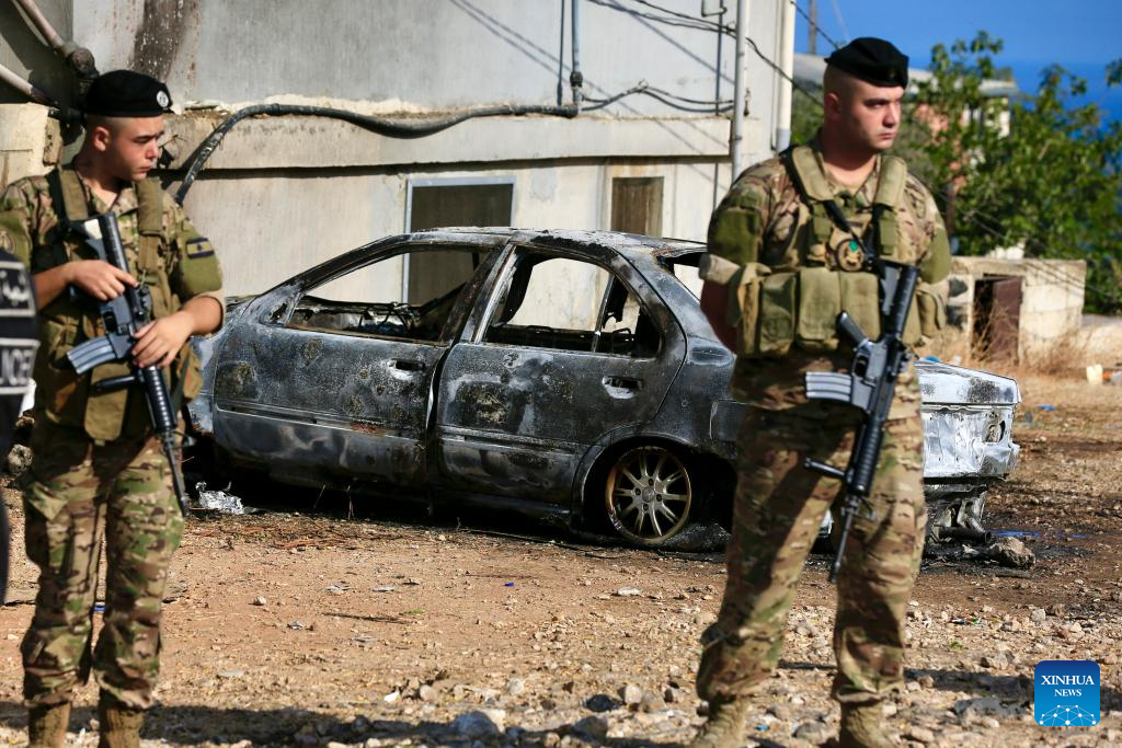 Lebanese soldiers are pictured near the wreckage of a car hit by Israeli drones in Jiyeh, Lebanon, on Sept. 9, 2025. (Photo by Ali Hashisho/Xinhua)