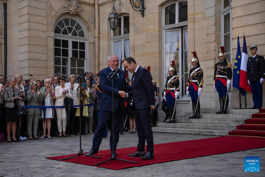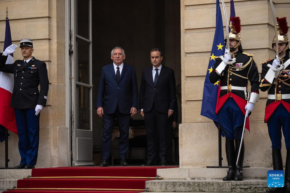 Newly appointed French Prime Minister Sebastien Lecornu (C) attends a handover ceremony with his predecessor Francois Bayrou (2nd L) at Matignon, the French prime minister's office, in Paris, France, Sept. 10, 2025. French President Emmanuel Macron named Defense Minister Sebastien Lecornu as the country's new prime minister on Tuesday evening. Lecornu, 39, has served as defense minister for more than three years and is regarded as a close ally of Macron, local media reported. The Elysee said his main task will be to consult with political parties to "build the necessary agreements for decisions in the coming months." (Photo by Aurelien Morissard/Xinhua)