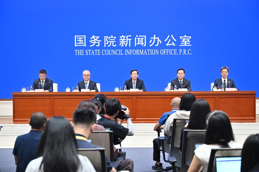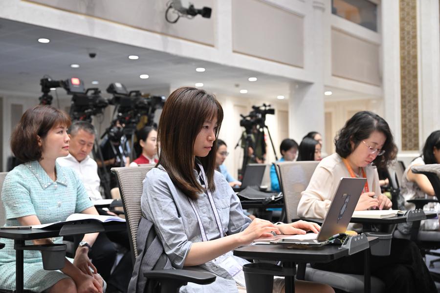 Vice Minister of Culture and Tourism Rao Quan (C, rear), also head of the National Cultural Heritage Administration (NCHA), attends a press conference held by the State Council Information Office (SCIO) on high-quality development of the cultural heritage sector during the 14th Five-Year Plan period (2021-2025) in Beijing, capital of China, Sept. 10, 2025. (Xinhua/Jin Liangkuai)