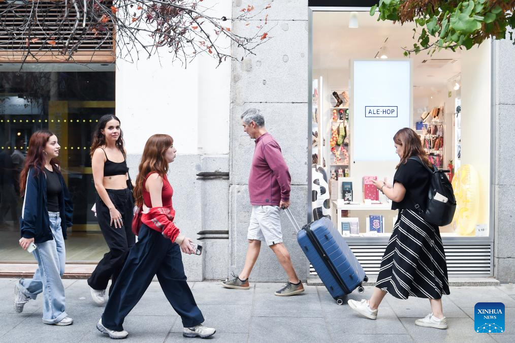 Tourists walk along a street in Madrid, capital of Spain, Sept. 10, 2025. Global international tourism grew 5 percent in the first half (H1) of 2025 compared with a year earlier, the United Nations World Tourism Organization (UN Tourism) reported Tuesday. UN Tourism expects the growth trend to continue through the second half of this year. (Photo by Gustavo Valiente/Xinhua)
