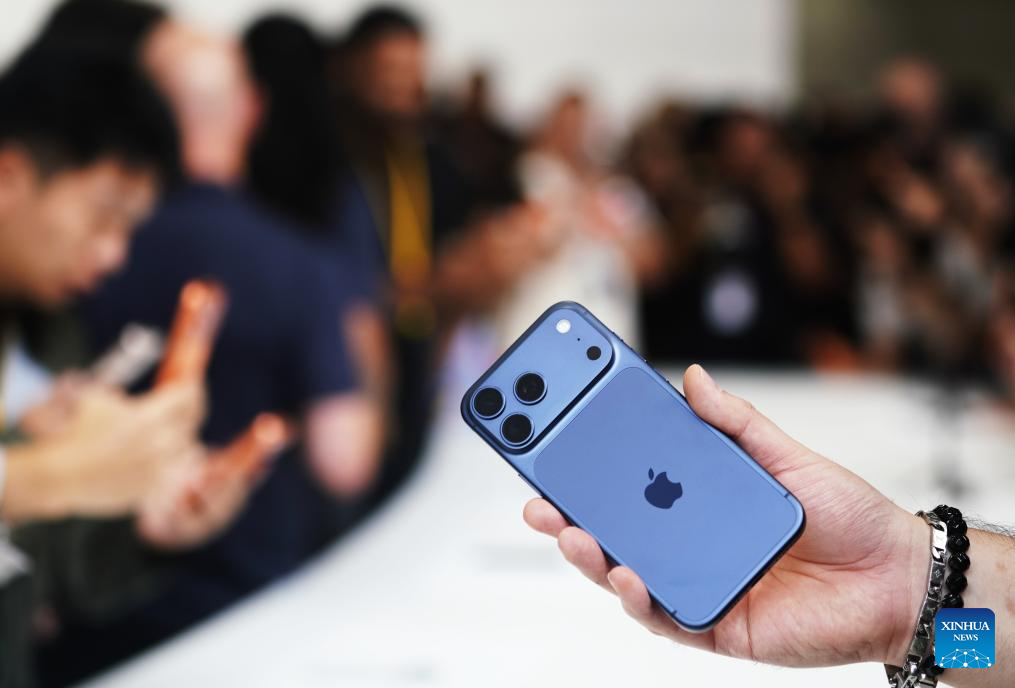 A new Apple mobile phone is pictured in Cupertino, California, the United States, on Sept. 9, 2025. Apple Inc. on Tuesday announced a series of new iPhones and wireless earphone products, including iPhone 17, all-new iPhone Air and AirPods Pro 3. (Xinhua/Wu Xiaoling)