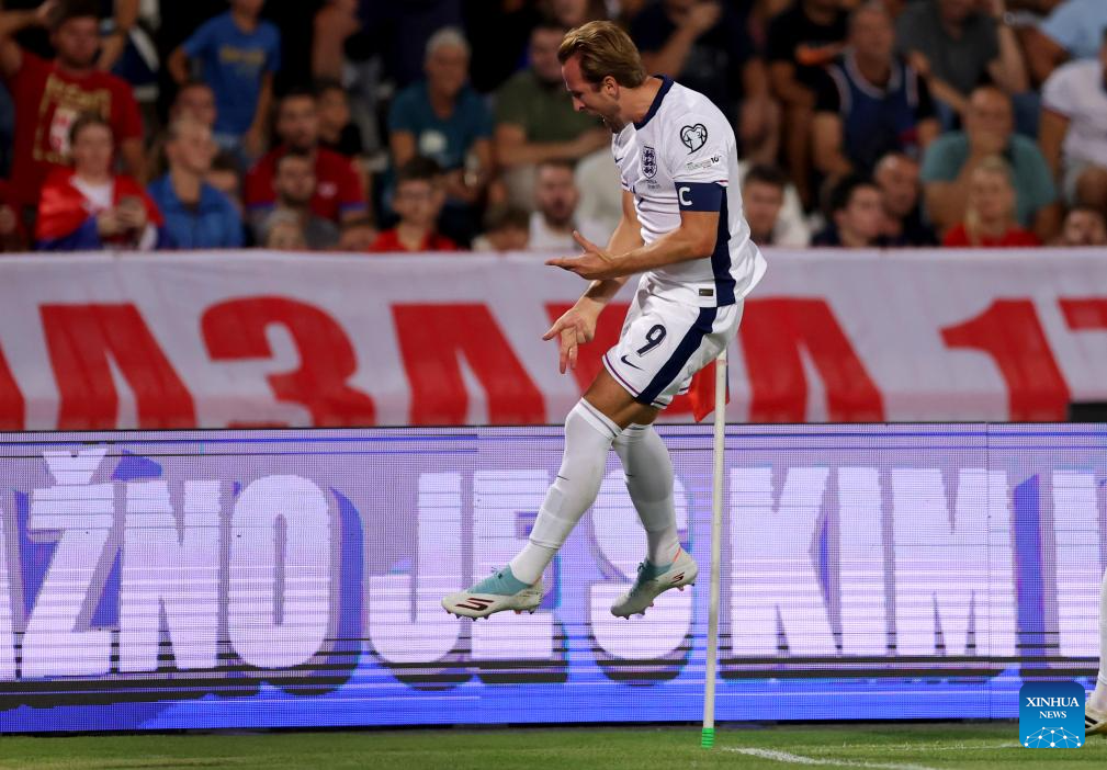 England's Harry Kane celebrates a goal during the Group K World Cup 2026 European Qualifiers football match between Serbia and England in Belgrade, Serbia, Sept. 9, 2025. (Photo by Predrag Milosavljevic/Xinhua)
