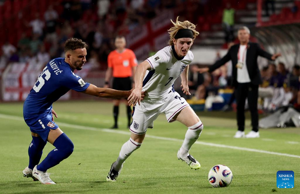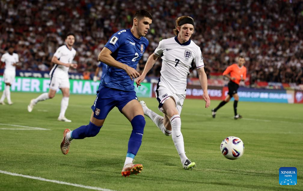 Serbia's Kosta Nedeljkovic (L) vies with England's Anthony Gordon during the Group K World Cup 2026 European Qualifiers football match between Serbia and England in Belgrade, Serbia, Sept. 9, 2025. (Photo by Predrag Milosavljevic/Xinhua)