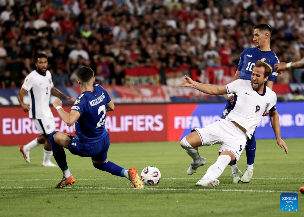 England's Harry Kane (R) vies with Serbia's Kosta Nedeljkovic during the Group K World Cup 2026 European Qualifiers football match between Serbia and England in Belgrade, Serbia, Sept. 9, 2025. (Photo by Predrag Milosavljevic/Xinhua)
