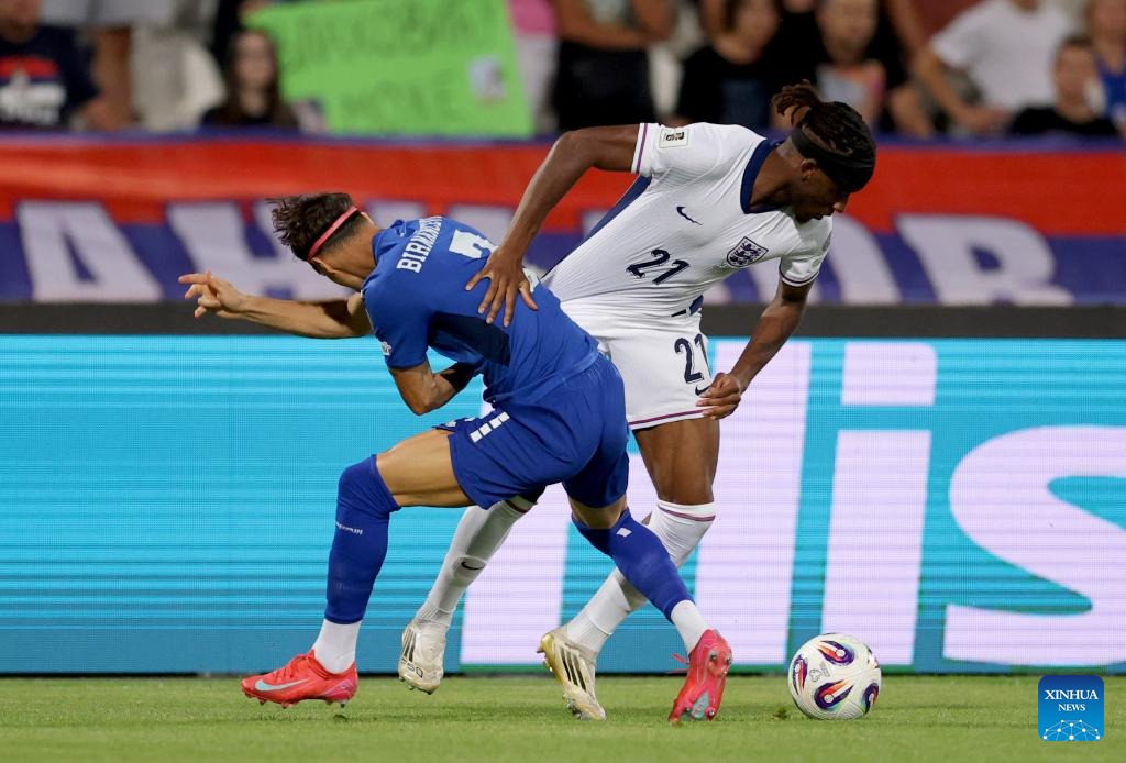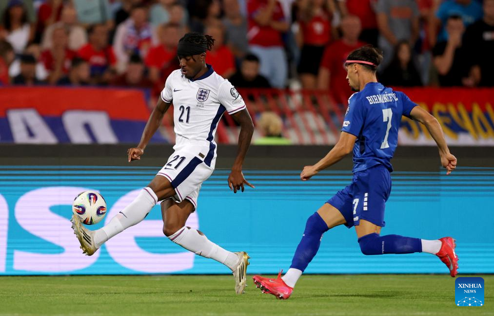 England's Noni Madueke (R) vies with Serbia's Veljko Birmancevic during the Group K World Cup 2026 European Qualifiers football match between Serbia and England in Belgrade, Serbia, Sept. 9, 2025. (Photo by Predrag Milosavljevic/Xinhua)