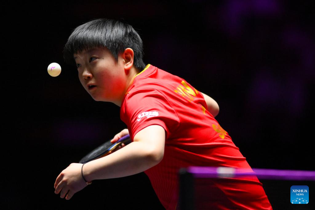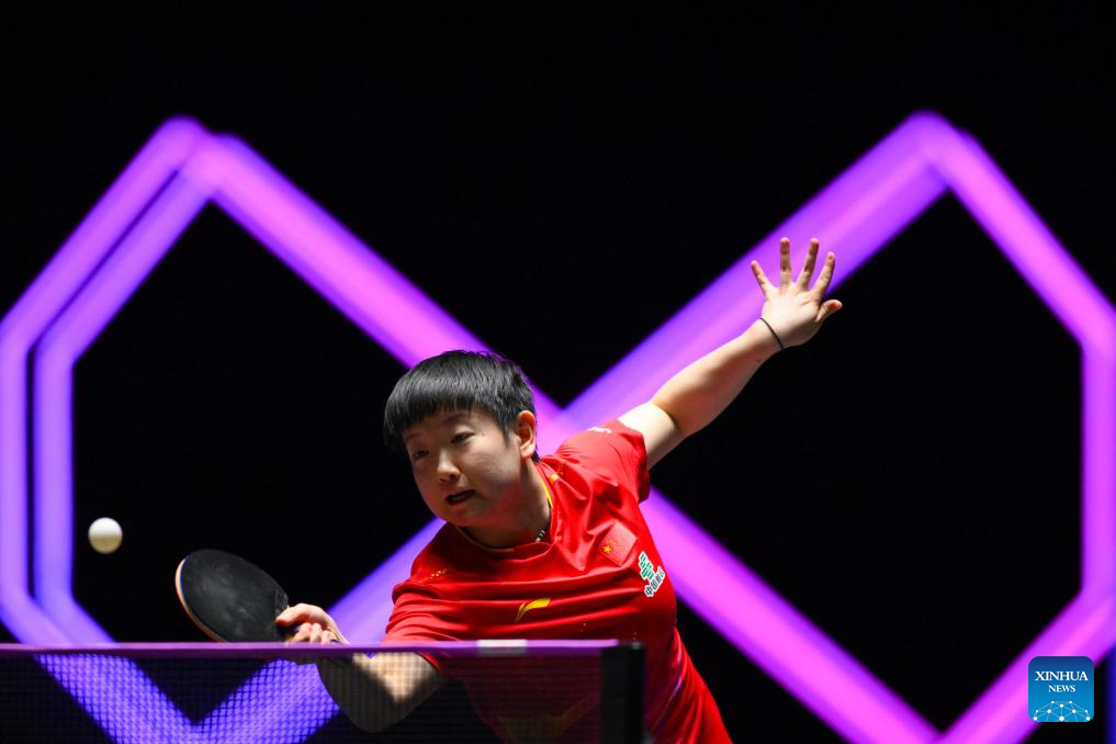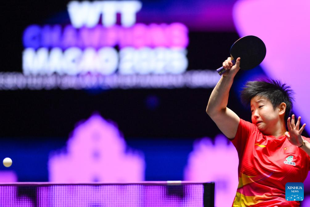 Sun Yingsha of China competes during the women's singles round of 32 match against Anna Hursey of Wales at the 2025 World Table Tennis (WTT) Champions Macao in Macao, south China, Sept.10, 2025. (Xinhua/Cheong Kam Ka)