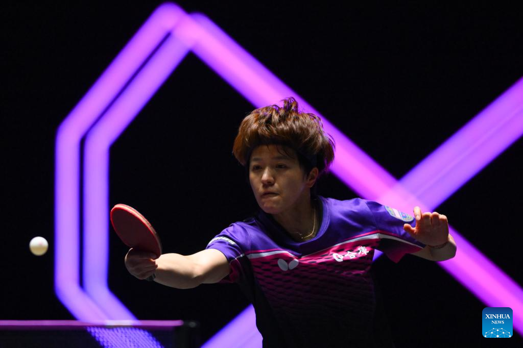 Hayata Hina of Japan hits a return during the women's singles round of 32 match against Huang Yi-Hua of Chinese Taipei at the 2025 World Table Tennis (WTT) Champions Macao in Macao, south China, Sept.10, 2025. (Xinhua/Cheong Kam Ka)