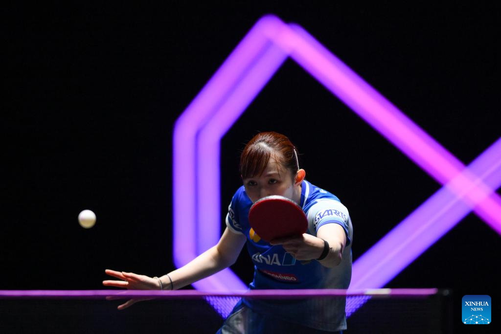 Huang Yi-Hua of Chinese Taipei hits a return during the women's singles round of 32 match against Hayata Hina of Japan at the 2025 World Table Tennis (WTT) Champions Macao in Macao, south China, Sept.10, 2025. (Xinhua/Cheong Kam Ka)