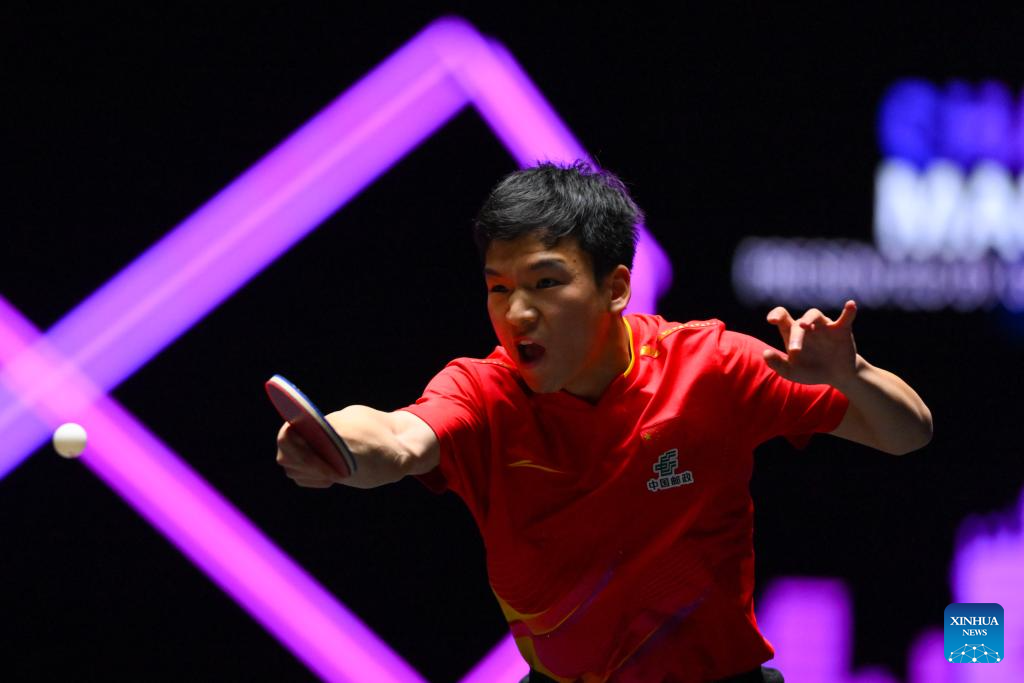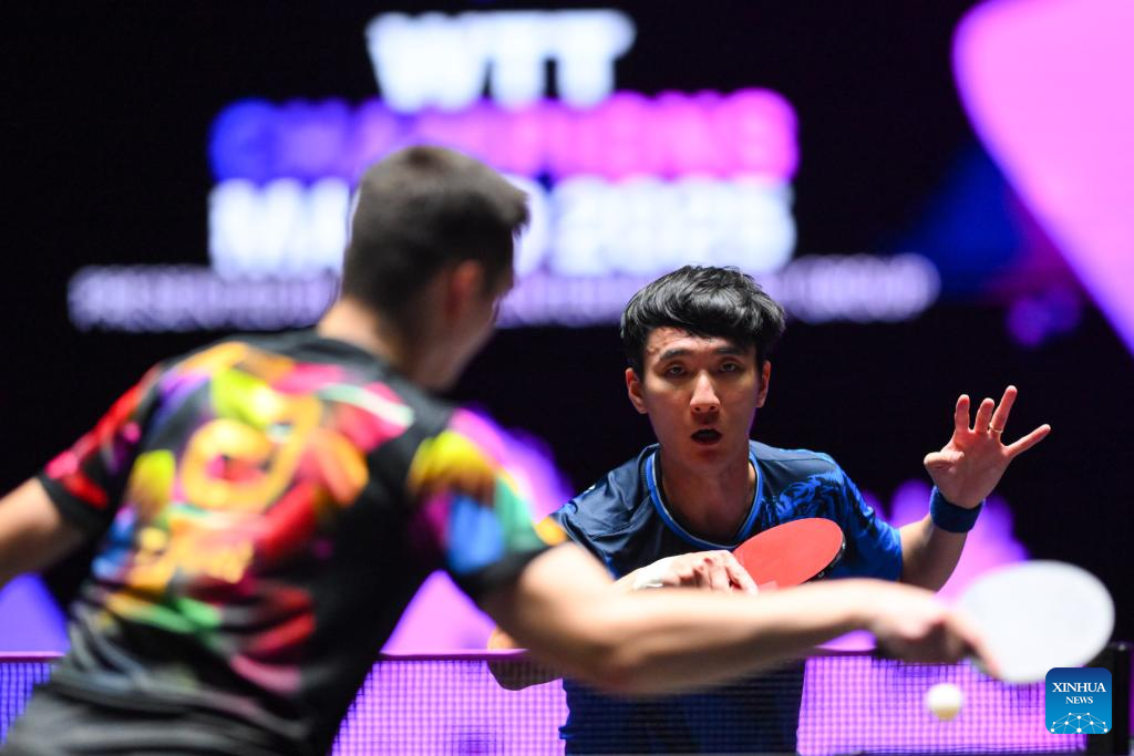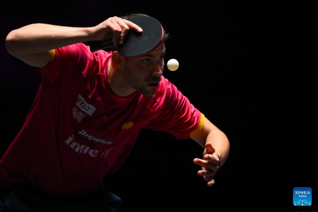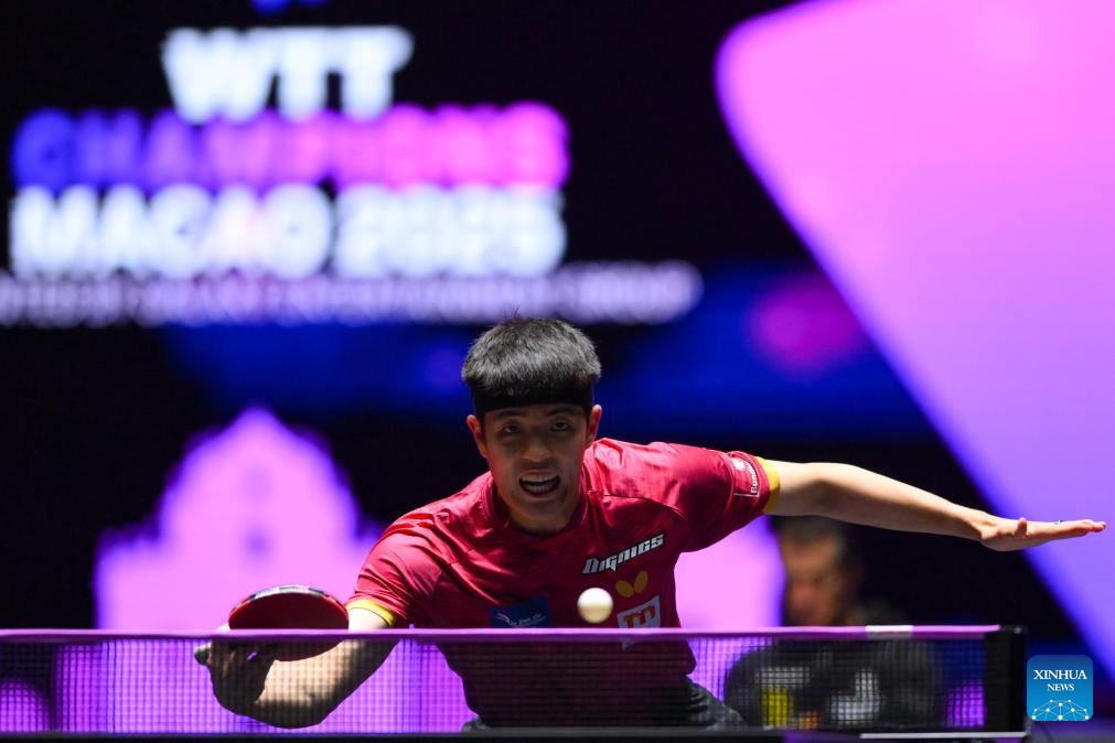 Qiu Dang of Germany hits a return during the men's singles round of 32 match against Kanak Jha of the United States at the 2025 World Table Tennis (WTT) Champions Macao in Macao, south China, Sept.10, 2025. (Xinhua/Cheong Kam Ka)