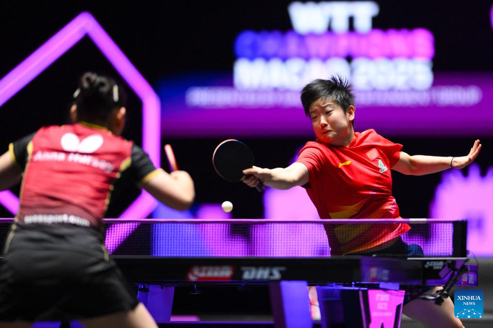 Sun Yingsha (R) of China competes during the women's singles round of 32 match against Anna Hursey of Wales at the 2025 World Table Tennis (WTT) Champions Macao in Macao, south China, Sept.10, 2025. (Xinhua/Cheong Kam Ka)