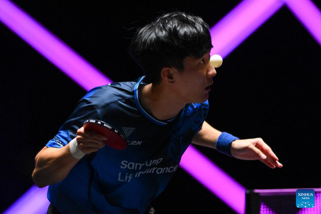 Lee Sang Su of South Korea serves during the men's singles round of 32 match against Thibault Poret of France at the 2025 World Table Tennis (WTT) Champions Macao in Macao, south China, Sept.10, 2025. (Xinhua/Cheong Kam Ka)