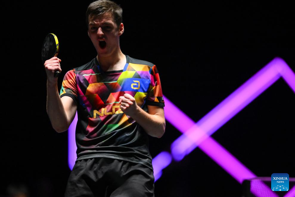 Thibault Poret of France celebrates during the men's singles round of 32 match against Lee Sang Su of South Korea at the 2025 World Table Tennis (WTT) Champions Macao in Macao, south China, Sept.10, 2025. (Xinhua/Cheong Kam Ka)