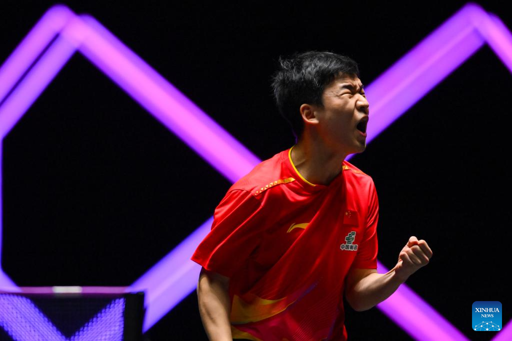 Xiang Peng of China reacts during the men's singles round of 32 match against Patrick Franziska of Germany at the 2025 World Table Tennis (WTT) Champions Macao in Macao, south China, Sept. 10, 2025. (Xinhua/Cheong Kam Ka)