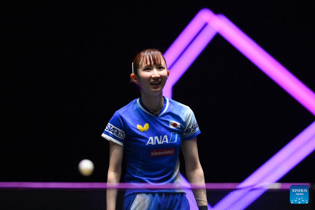 Hayata Hina of Japan reacts during the women's singles round of 32 match against Huang Yi-Hua of Chinese Taipei at the 2025 World Table Tennis (WTT) Champions Macao in Macao, south China, Sept.10, 2025. (Xinhua/Cheong Kam Ka)