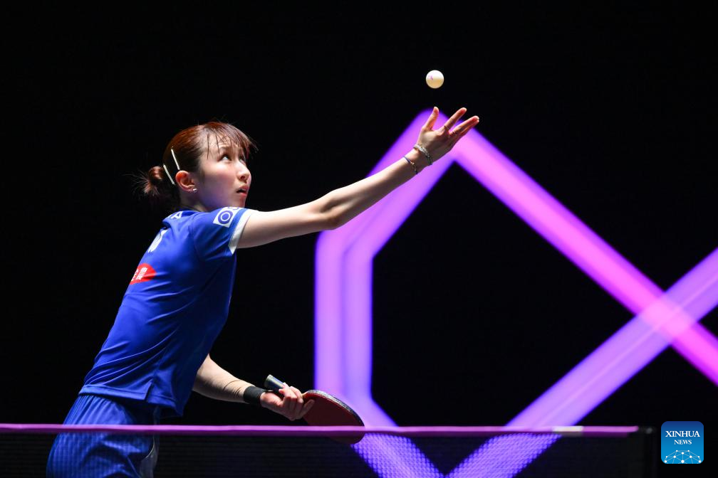 Hayata Hina of Japan serves during the women's singles round of 32 match against Huang Yi-Hua of Chinese Taipei at the 2025 World Table Tennis (WTT) Champions Macao in Macao, south China, Sept.10, 2025. (Xinhua/Cheong Kam Ka)