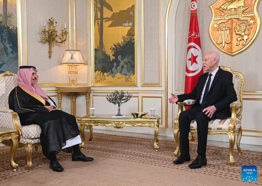 TUNIS, Sept. 9 (Xinhua) -- Tunisian President Kais Saied on Tuesday received visiting Saudi Foreign Minister Faisal bin Farhan Al Saud to discuss bilateral ties and regional issues, the Tunisian presidency said in a statement.