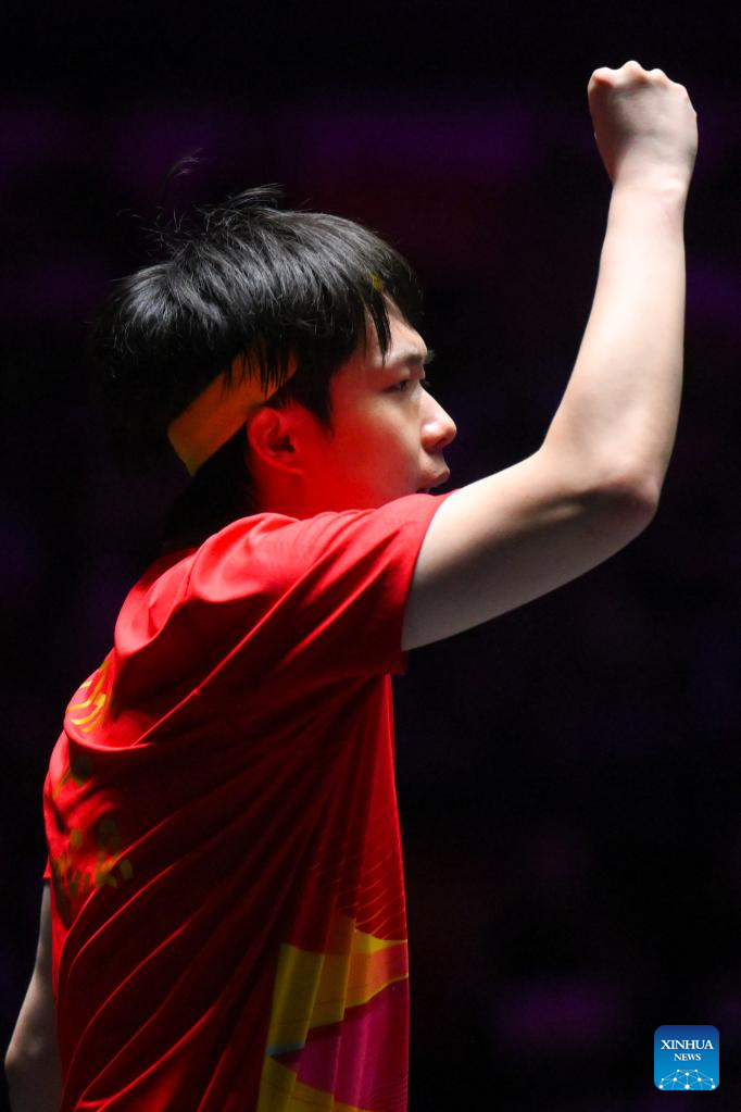 Wang Chuqin of China reacts during the men's singles round of 16 match against Jonathan Groth of Denmark at the 2025 World Table Tennis (WTT) Champions Macao in Macao, south China, Sept. 11, 2025. (Xinhua/Cheong Kam Ka)