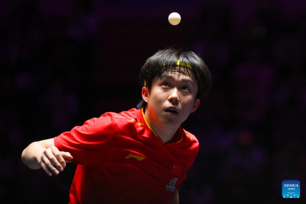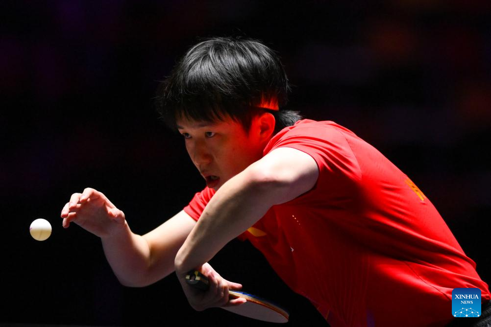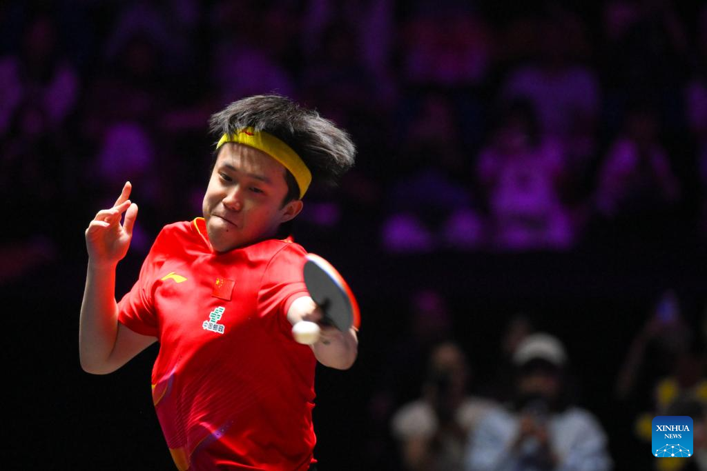 Wang Chuqin of China competes during the men's singles round of 16 match against Jonathan Groth of Denmark at the 2025 World Table Tennis (WTT) Champions Macao in Macao, south China, Sept. 11, 2025. (Xinhua/Cheong Kam Ka)