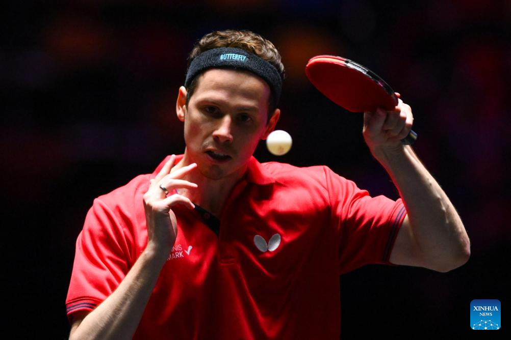 Jonathan Groth of Denmark competes during the men's singles round of 16 match against Wang Chuqin of China at the 2025 World Table Tennis (WTT) Champions Macao in Macao, south China, Sept. 11, 2025. (Xinhua/Cheong Kam Ka)
