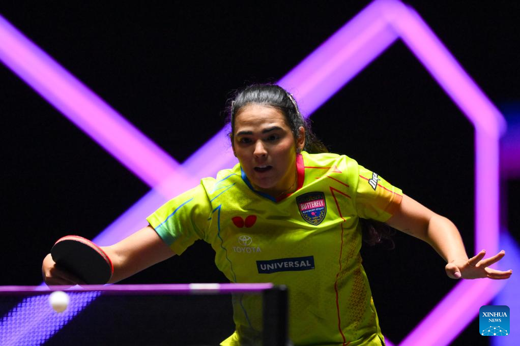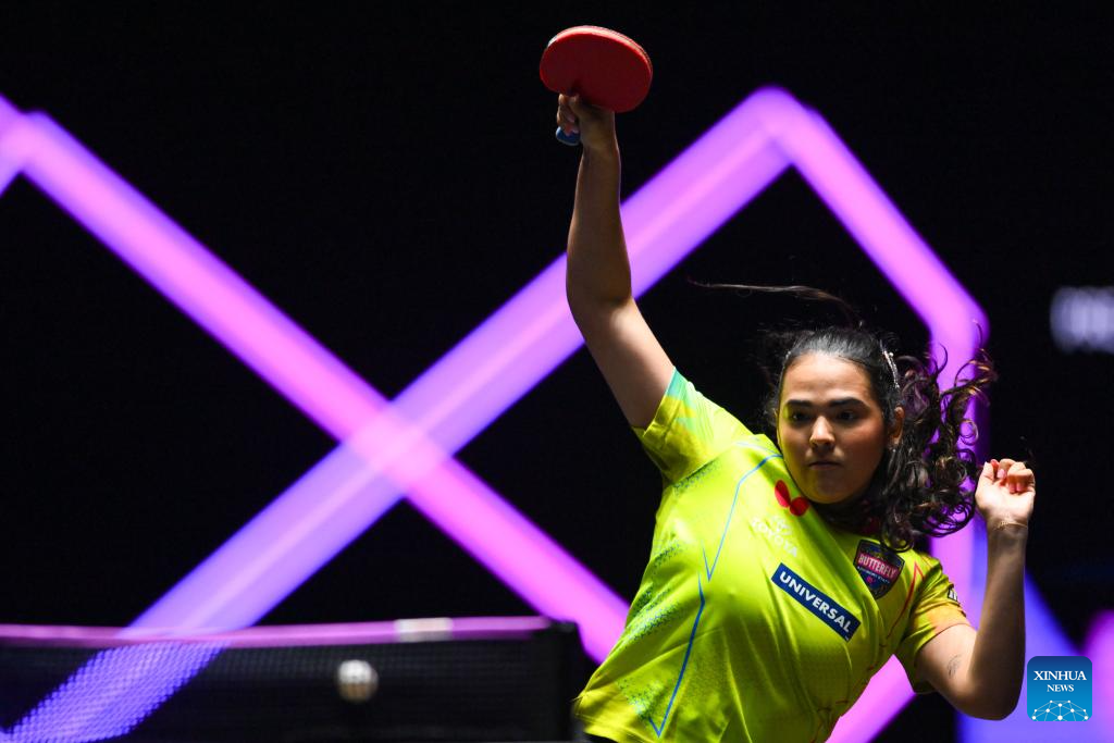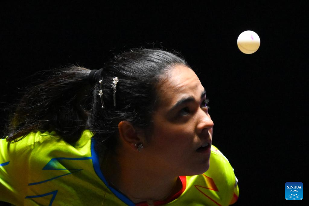 Adriana Diaz of Puerto Rico competes during the women's singles round of 16 match against Wang Yidi of China at the 2025 World Table Tennis (WTT) Champions Macao in Macao, south China, Sept. 11, 2025. (Xinhua/Cheong Kam Ka)
