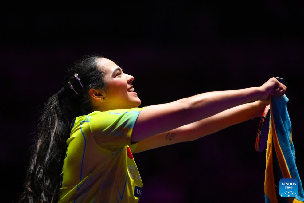 Adriana Diaz of Puerto Rico celebrates after the women's singles round of 16 match against Wang Yidi of China at the 2025 World Table Tennis (WTT) Champions Macao in Macao, south China, Sept. 11, 2025. (Xinhua/Cheong Kam Ka)