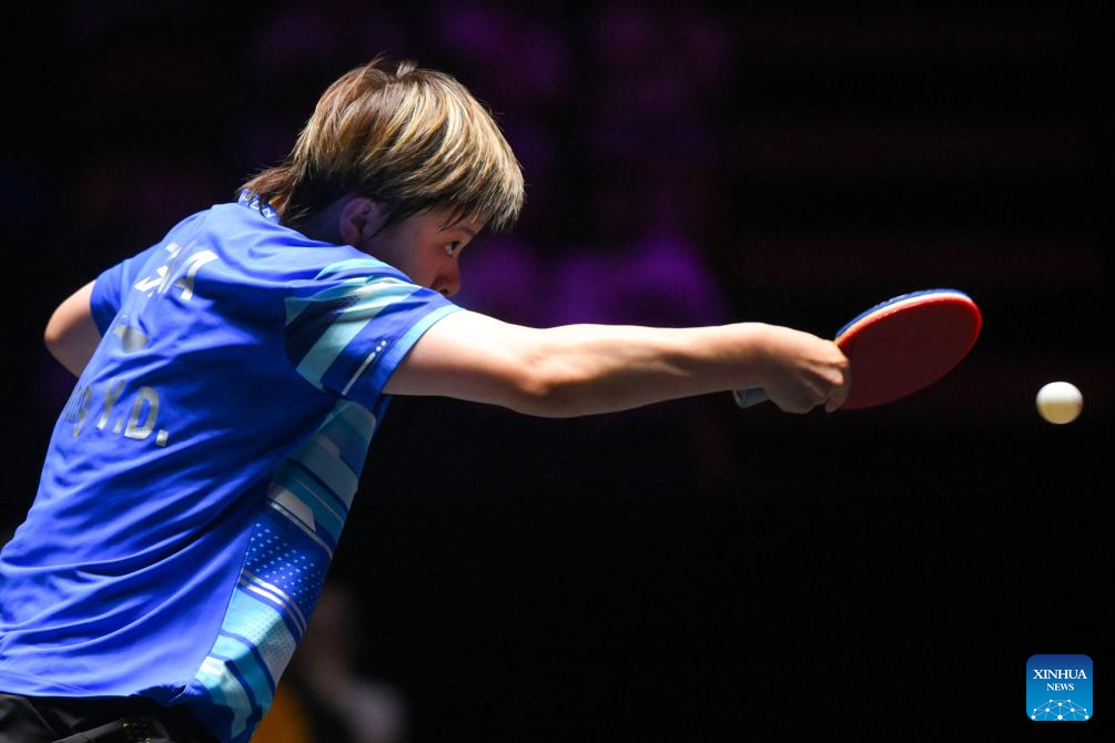 Wang Yidi of China competes during the women's singles round of 16 match against Adriana Diaz of Puerto Rico at the 2025 World Table Tennis (WTT) Champions Macao in Macao, south China, Sept. 11, 2025. (Xinhua/Cheong Kam Ka)