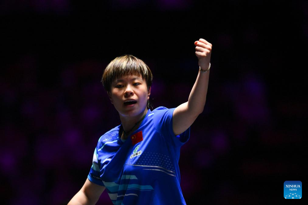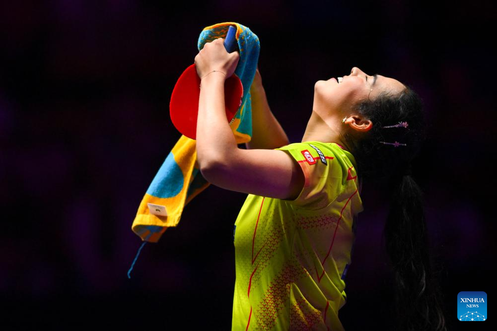 Wang Yidi of China reacts during the women's singles round of 16 match against Adriana Diaz of Puerto Rico at the 2025 World Table Tennis (WTT) Champions Macao in Macao, south China, Sept. 11, 2025. (Xinhua/Cheong Kam Ka)