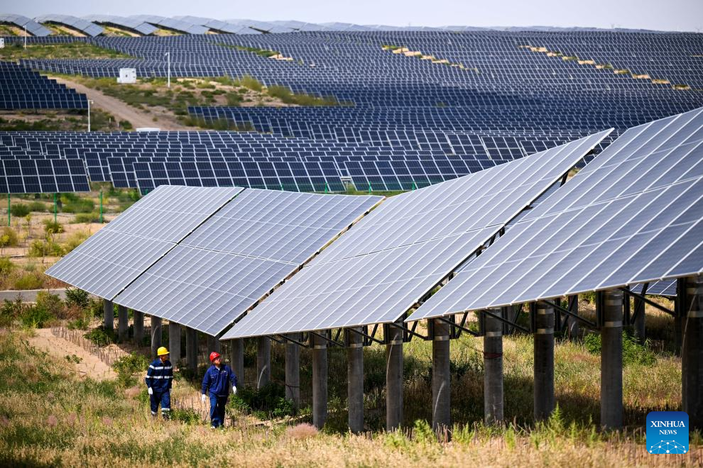 This photo taken on Sept. 10, 2025 shows workers walking at the Dalad Banner photovoltaic base in the Kubuqi Desert, north China's Inner Mongolia Autonomous Region. In the Kubuqi Desert, rows of blue solar panels stretch across the sands, turning the desert into a sea of clean energy. In recent years, the area has adopted a "PV-based desert control" model, generating green electricity above while restoring the ecosystem below. This approach not only boosts new energy development but also helps combat desertification. (Xinhua/Li Zhipeng)