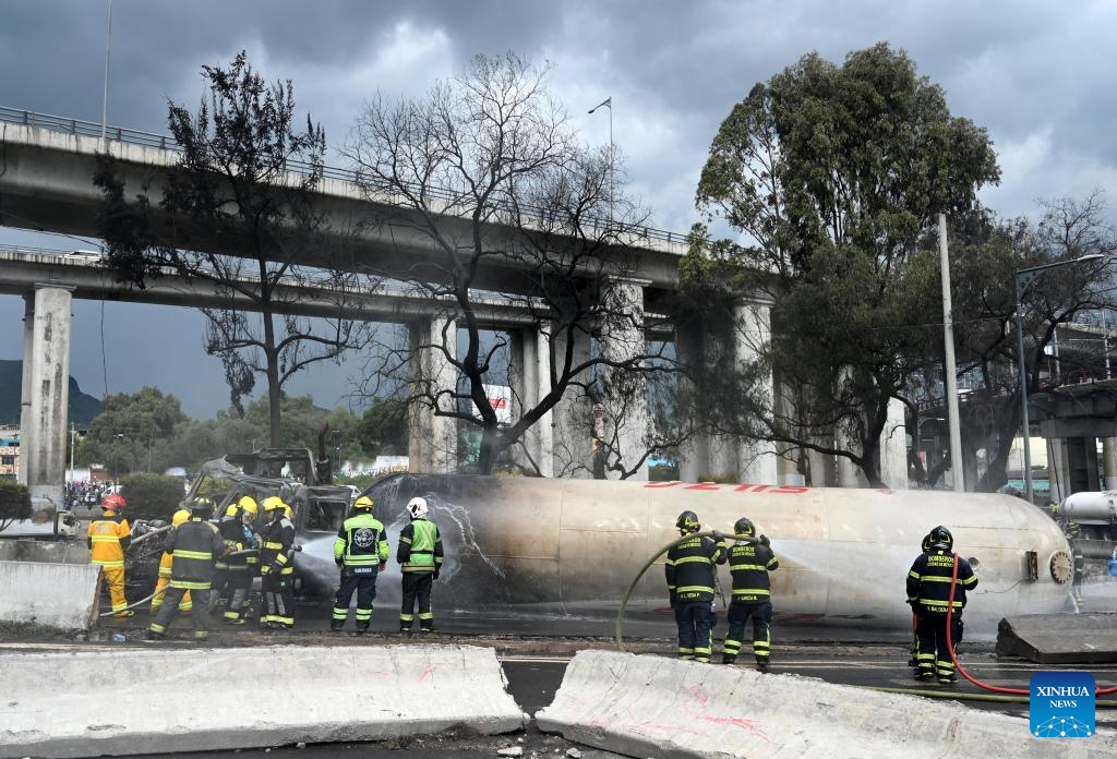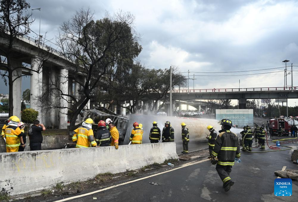 Firefighters work at the gas tanker truck explosion accident site in Mexico City, Mexico, Sept. 10, 2025. Fifty-seven people were injured after a gas tanker truck exploded on Wednesday in Mexico City, with 19 of them in serious condition, local authorities said. (Str/Xinhua)