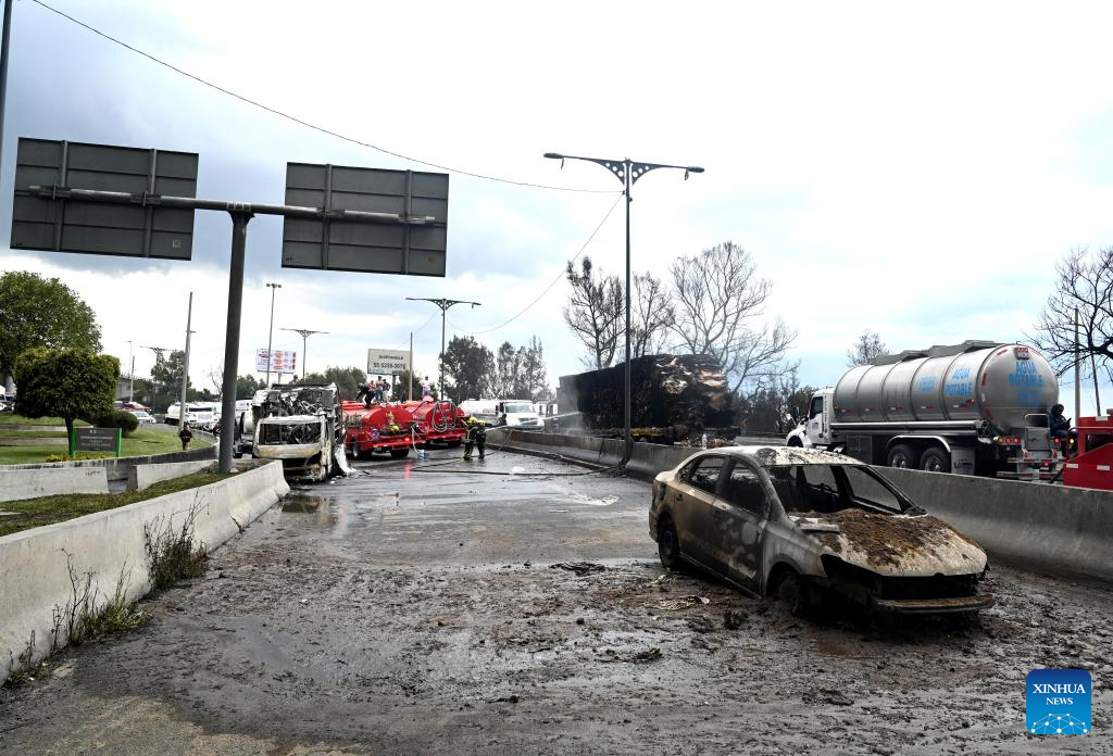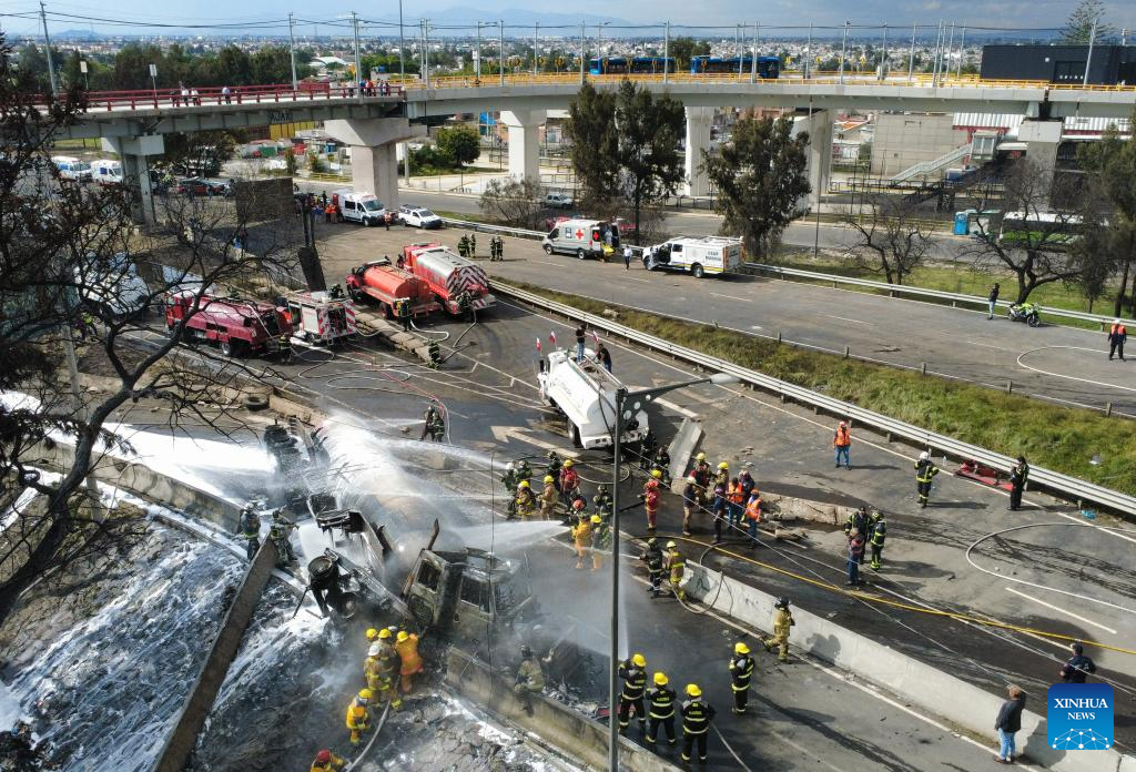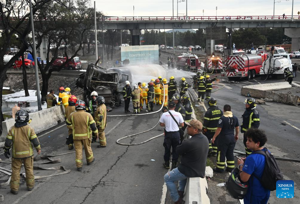 Photo taken on Sept. 10, 2025 shows the gas tanker truck explosion accident site in Mexico City, Mexico. Fifty-seven people were injured after a gas tanker truck exploded on Wednesday in Mexico City, with 19 of them in serious condition, local authorities said. (Str/Xinhua)