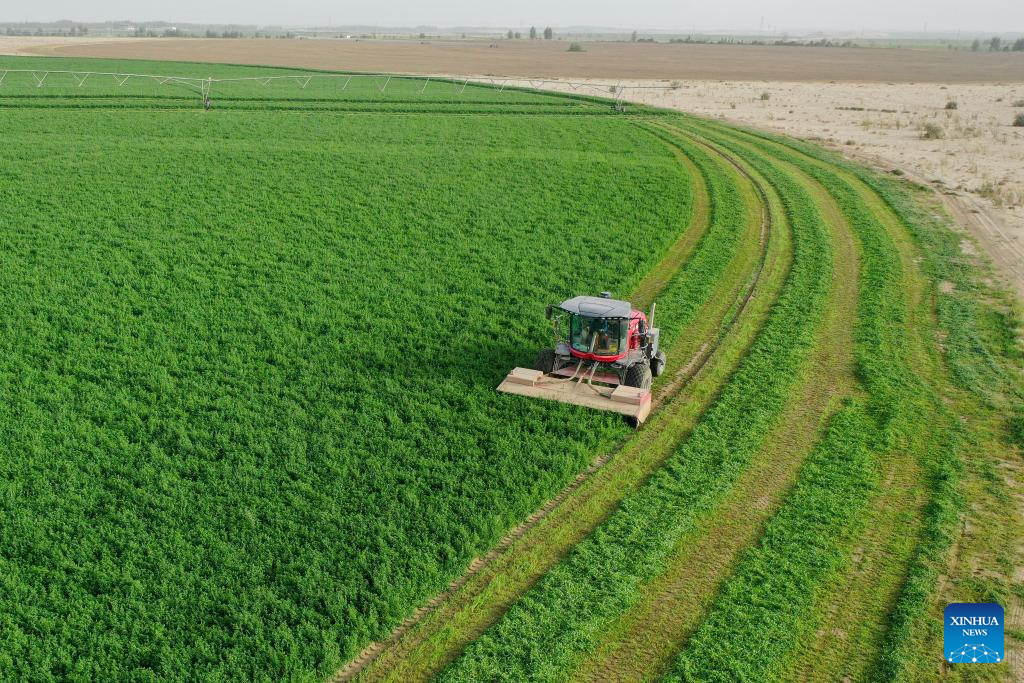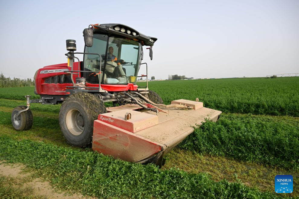 A farm machinery operator drives a machine to harvest alfalfa at an alfalfa planting demonstration base in Hotan County of Hotan Prefecture, northwest China's Xinjiang Uygur Autonomous Region, on Sept. 10, 2025. Alfalfa planting has provided stable forage supply for the local animal husbandry. Meanwhile, a "cooperative plus enterprise" development mode made it possible to establish a complete industrial chain of alfalfa planting, processing and sales in Hotan, which not only helped to build an ecological barrier, but also boosted income of farmers. (Xinhua/Ding Lei)