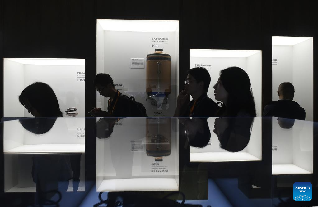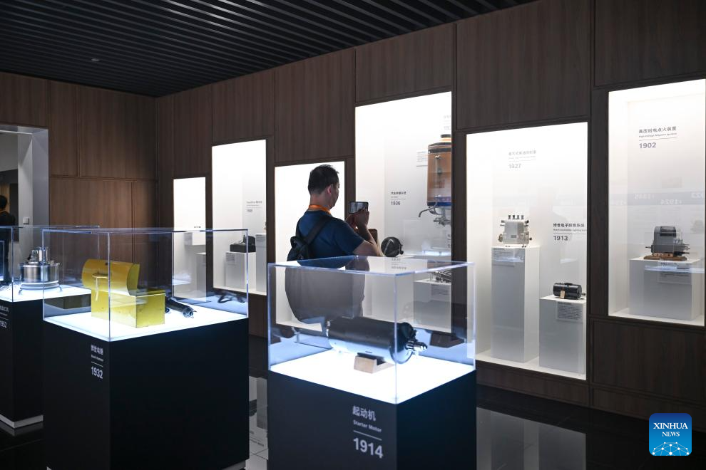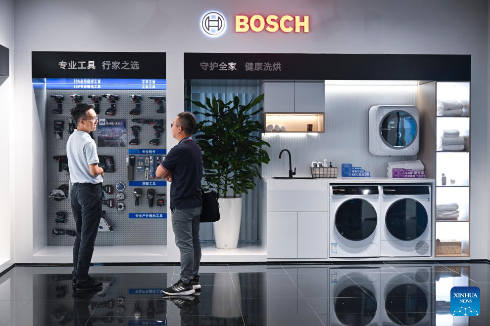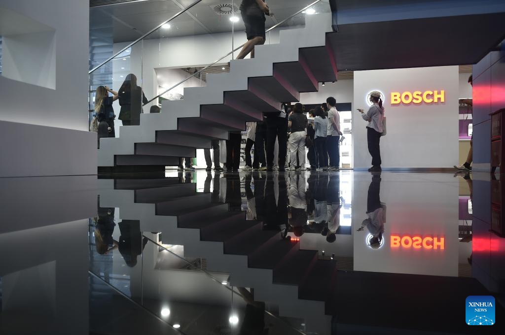 People visit an exhibition hall of Bosch in Shanghai Hongqiao Airport Economic Zone in east China's Shanghai, Sept. 10, 2025. Covering an area of 13.89 square kilometers, Shanghai Hongqiao Airport Economic Zone, the first national-level airport economic zone in the Yangtze River Delta, has now gathered over 4,000 enterprises, among which foreign-funded enterprises account for about a quarter. In 2024, the economic aggregate of the economic zone reached 21.1 billion yuan (about 2.96 billion U.S. dollars). (Xinhua/Chen Haoming)