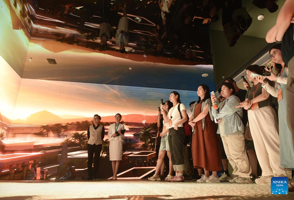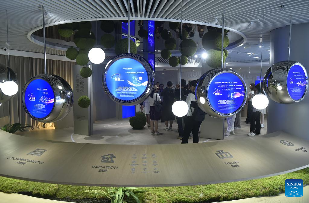People visit an exhibition hall of Trip.com Group in Shanghai Hongqiao Airport Economic Zone in east China's Shanghai, Sept. 10, 2025. Covering an area of 13.89 square kilometers, Shanghai Hongqiao Airport Economic Zone, the first national-level airport economic zone in the Yangtze River Delta, has now gathered over 4,000 enterprises, among which foreign-funded enterprises account for about a quarter. In 2024, the economic aggregate of the economic zone reached 21.1 billion yuan (about 2.96 billion U.S. dollars). (Xinhua/Lu Peng)