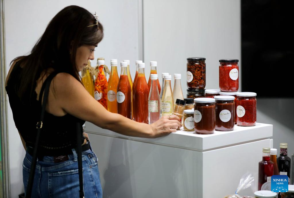 A woman views products displayed at the Agri Lebanon Expo in Beirut, Lebanon, on Sept. 10, 2025. The event, held from Sept. 10 to 12, brings together farmers, agribusinesses, technology providers, and policymakers to showcase the latest innovations, foster sustainable practices, and drive economic growth across the agrifood sector. (Xinhua/Bilal Jawich)